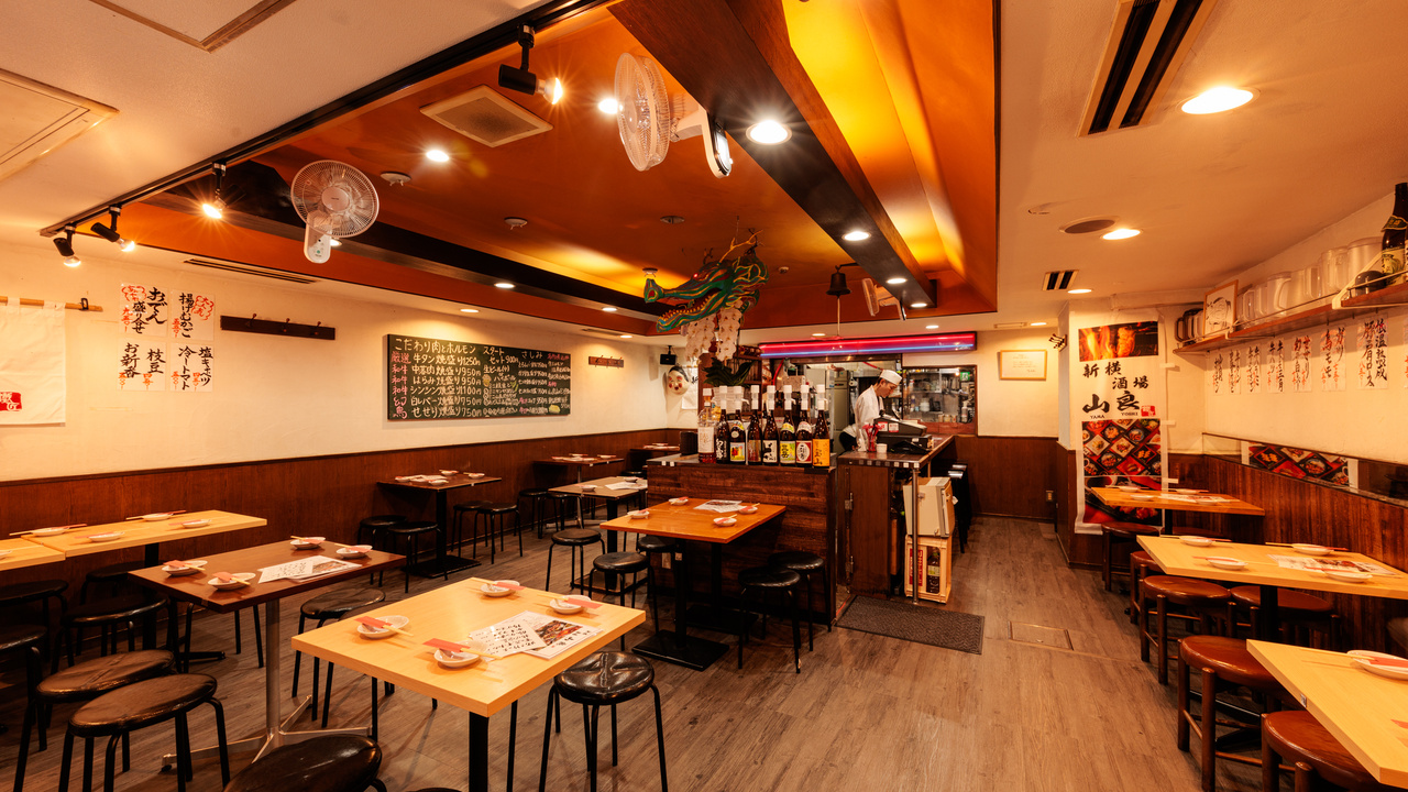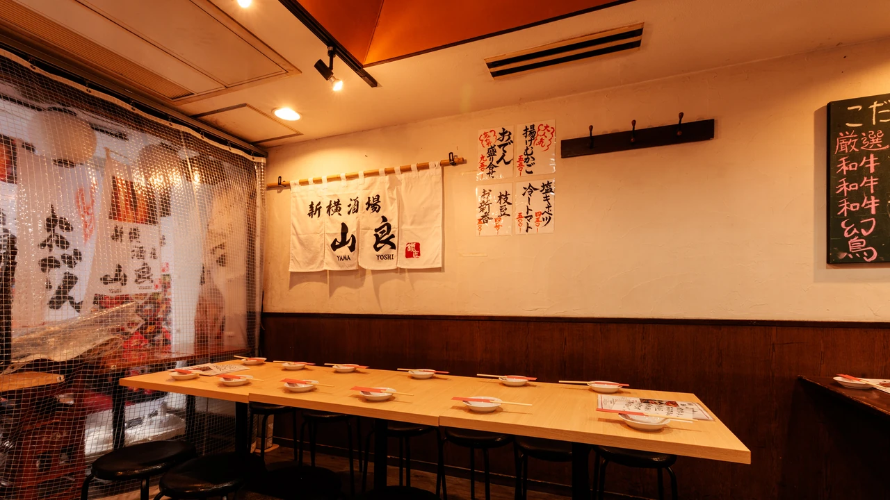 新横酒場 山良の席・空間和モダンを意識したノスタルジックな店内 どこか懐かしさが感じられる店内は、普段着にサンダル履きでも気軽に入れる雰囲気です!テーブル席は、2名様用から最大10名様までご利用いただけるお席をご用意しております。 お仕事帰りやおひとり様でのお食事はもちろん、外での立ち飲みもできますので、ちょい飲みやはしご酒にもオススメです◎ 席・空間